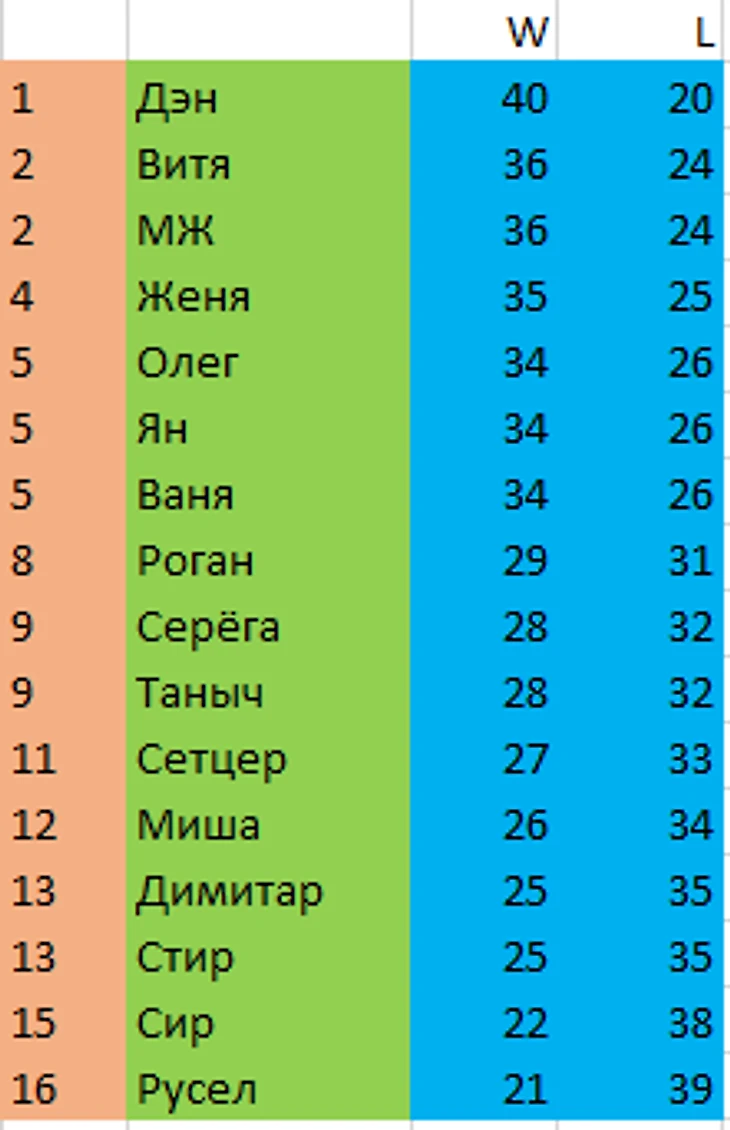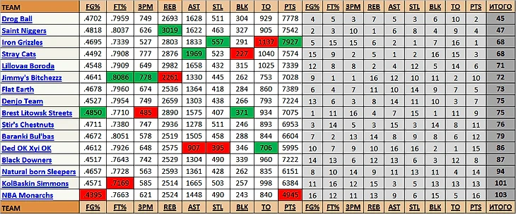 Высока конкуренция в нашей лиге, поэтому даже к Тунцу и Яннису нужно стараться добирать вменяемых помогатых, а не по-мажорски куражиться с Сэтиком и корытом Лавинем. В итоге сезон у теперь уже экс-чемпа Андрюхи ушёл в трубу. Из всего драфта норм зашли разве что Хорфик, звездун Лу и с натяжкой РХД. Правда, судя по чудо-табличкам самого же Андрея, команда была вполне себе сбалансированной. За графику отдельное спасибо!