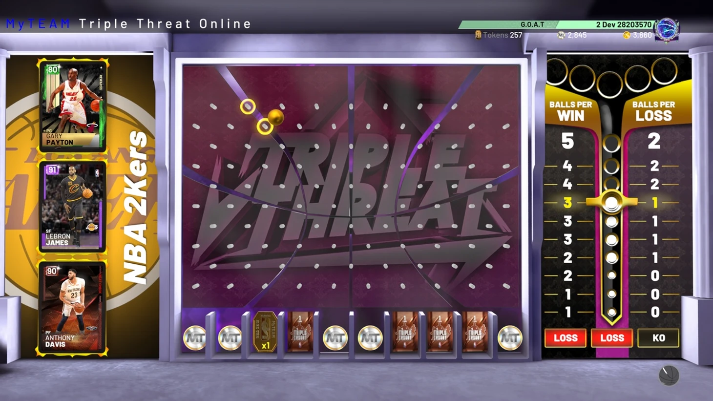После каждой игры вы заработаете определенное количество шариков, которые вы сможете кинуть для получения конкретных наград. В Triple Threat Online вы продолжите играть серии до 10 игр, пока не получить 3 поражения. Если вы выиграете все 10 игр, то вам выпадет 5 шариков, что означает - 5 наград! Призы будут включать в себя: МТ, токены, паки, а иногда и уникальные карточки, которые вы сможете получить только в данном режиме.