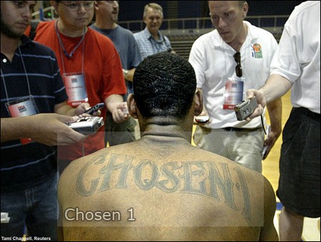 Ну и первая тату ЛеБрона находится на его спине. На ней изображено “CHOSEN1″, что в переводе означает "Избранный". Похоже этой надписью Джеймс хорошенько так потешил свое самолюбие. Хотя ходит слух, что эта татуировка уже была на юном теле будущего короля, в тот момент, когда он родился.