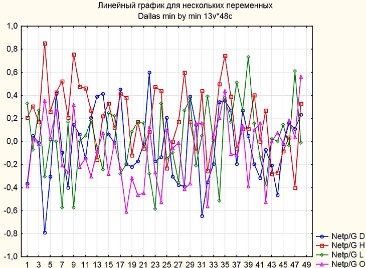 А это график PIPM Далласа и соперника: значения разнонаправленны (коэффициент корреляции -0,78) и если бы они были когерентными волнами, то при интерференции почти полностью гасили друг друга. Да, это результат за 12 игр, а не 82, но выбор игр путём случайного выпадения делает выборку максимально репрезентативной. В неё, например, попали две игры с Финиксом, который тоже звёзд с тебя не хватал.