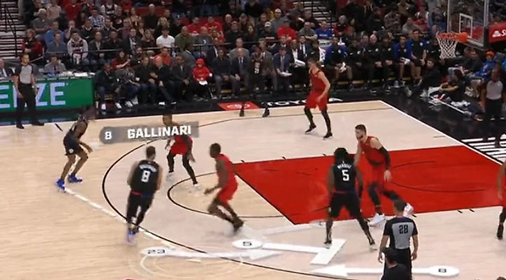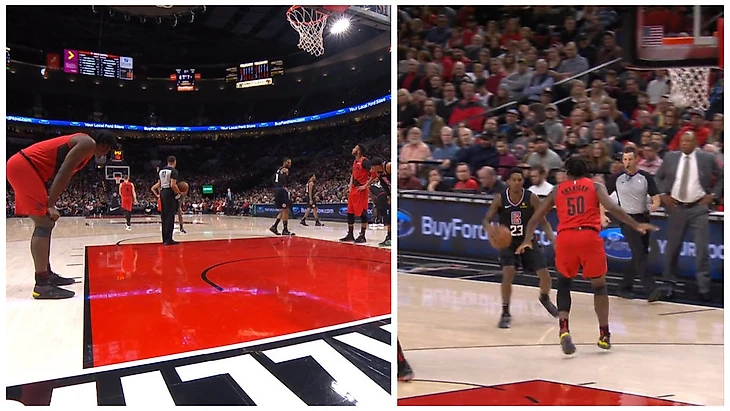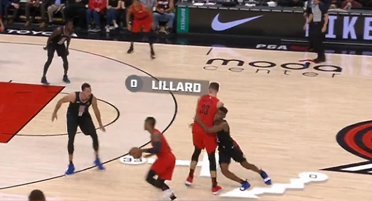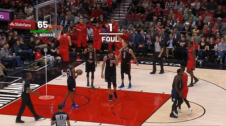 Вот еще пример: Бобан Марьянович получил первый фол, нарушив правила на Юсуфе Нуркиче. Зритель узнает, что с вероятностью в 65% центровой «Портленда» бы отличился.