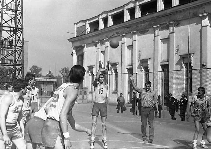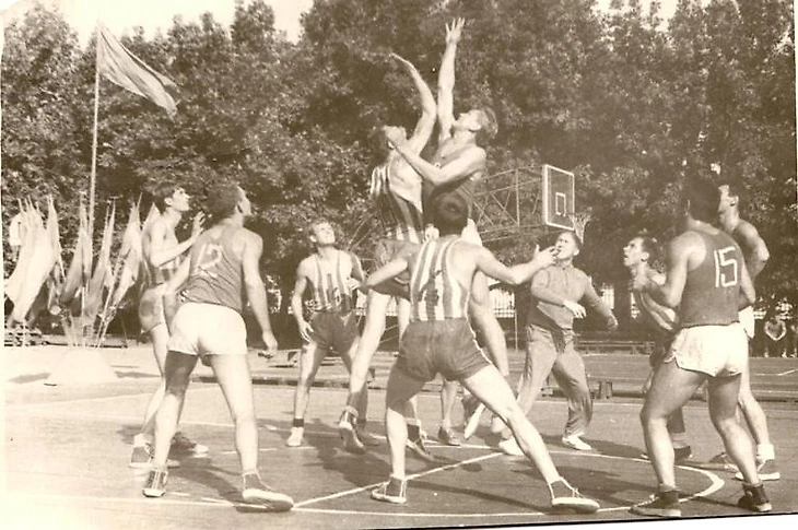 Матч студенческих команд на площадке у Западной трибуны стадиона «Труд». Штрафные броски выполняет Александр Старосельцев (№ 15)