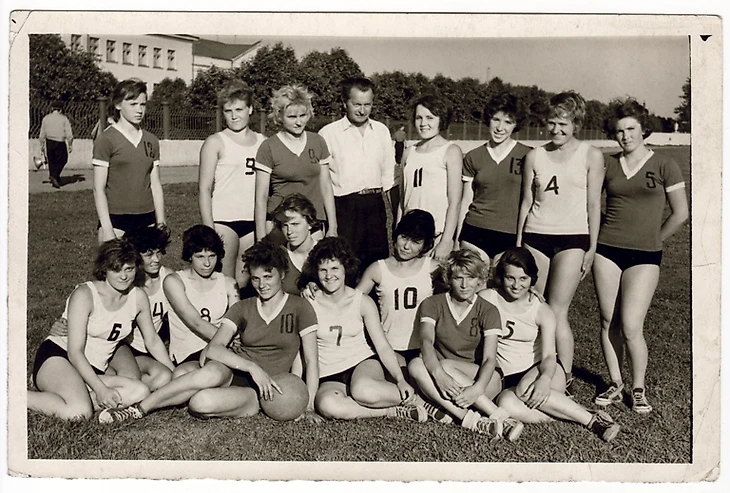 Женская команда «Шахтер» (Черемхово) на своем стадионе. 1965 год. В первом ряду третья справа Антонина Лю Фа, седьмая – Виктория Уварова. В центре — Петрас Валюшайтис