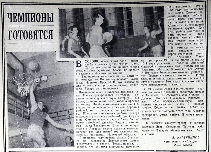 Очерк о команде «Ермак» в ангарской городской газете «Знамя коммунизма», № 9 от 14 января 1966 года