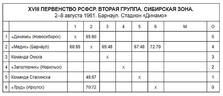 1961. «Спартак» окончательно уходит с баскетбольных полей Иркутска — сильнейшей командой областного центра на предстоящее десятилетие становится команда завода им. Куйбышева, тренирует которую опытный (чемпион РСФСР в составе свердловского «Зенита») Иван Иванович Буров. На основе заводской команды и новоиспеченного чемпиона области черемховского «Шахтера» формируется команда «Труд» для участия в региональном турнире ПЕРВЕНСТВА РСФСР (ВТОРАЯ ГРУППА) в Барнауле (2–8 августа), где первенствует команда Новосибирска, на втором месте — алтайский «Медик» (иркутская команда проиграла ему 70:72), на третьем — омичи. В турнире женщин на первом месте — Кемерово, на втором — черемховский «Шахтер», на третьем — Новосибирск.
