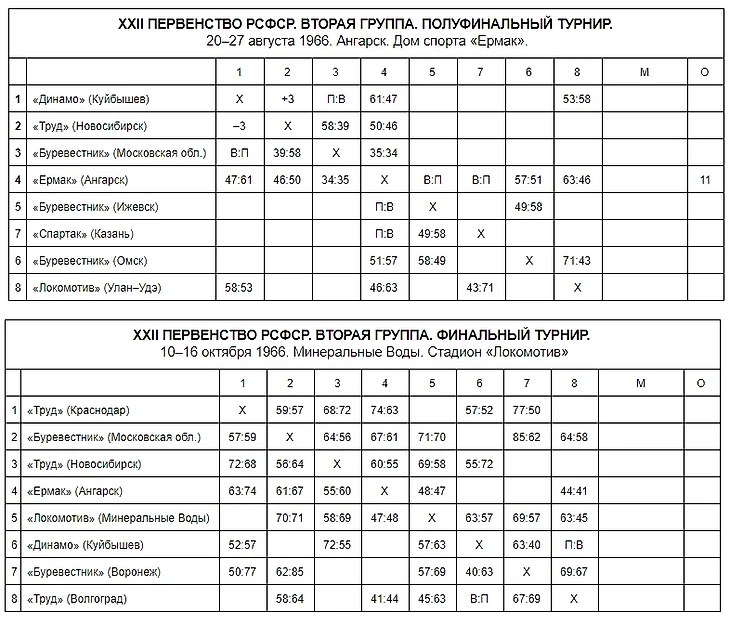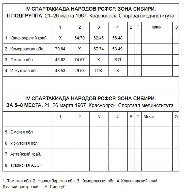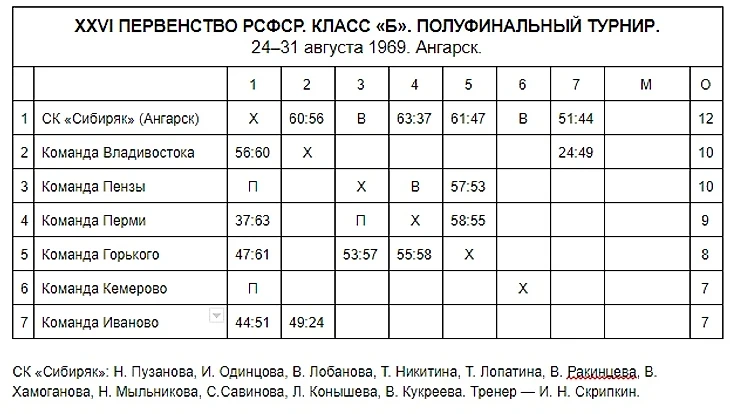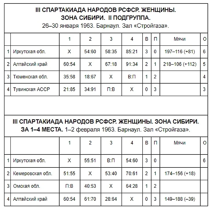 ФИНАЛЬНЫЙ ТУРНИР III СПАРТАКИАДЫ НАРОДОВ РСФСР, на который собрались 12 сильнейших сборных республики, прошел с 7 по 15 апреля в Ярославском городском доме физической культуры. Волевые победы над командами Приморского — 39:38 и Краснодарского краев — 48:47 и поражение от сборной Ростовской области — 33:61 позволили женской сборной области (сформированной на базе черемховского «Шахтера») выйти из подгруппы в финальный турнир, где они и замкнули шестерку сильнейших (поражения от сборных Свердловской — 27:54, Пензенской — 31:51, Новосибирской и Московской областей). Шестое место на республиканской Спартакиаде — высшее достижение за всю историю иркутского женского баскетбола. Первое место заняла сборная Ростовской области, второе — Новосибирской области, третье — свердловчанки (все три команды набрали одинаковое количество очков). Все эти три команды играют на тот момент в классе «А» чемпионата СССР.