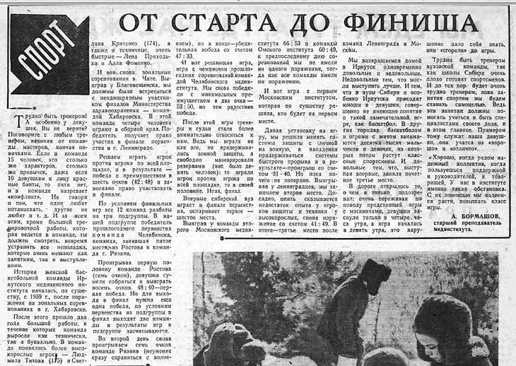 Противостояние студенческих команд медицинского и политехнического институтов в рамках ЧЕМПИОНАТА ВУЗОВ ИРКУТСКОЙ ОБЛАСТИ в этом сезоне заканчивается в пользу «Медика» — 75:73. Команда на первенстве Минздрава РСФСР в Ставрополе становится третьей. Состав команды: Юрий Сычугов, Игорь Цыганов, Андрея Рязанов, Николай Преловский, Вячеслав Корвицкий, Игорь Топоров, Вячеслав Кириллов, Анатолий Пивоваров. Тренер — Юрий Александрович Наумов.