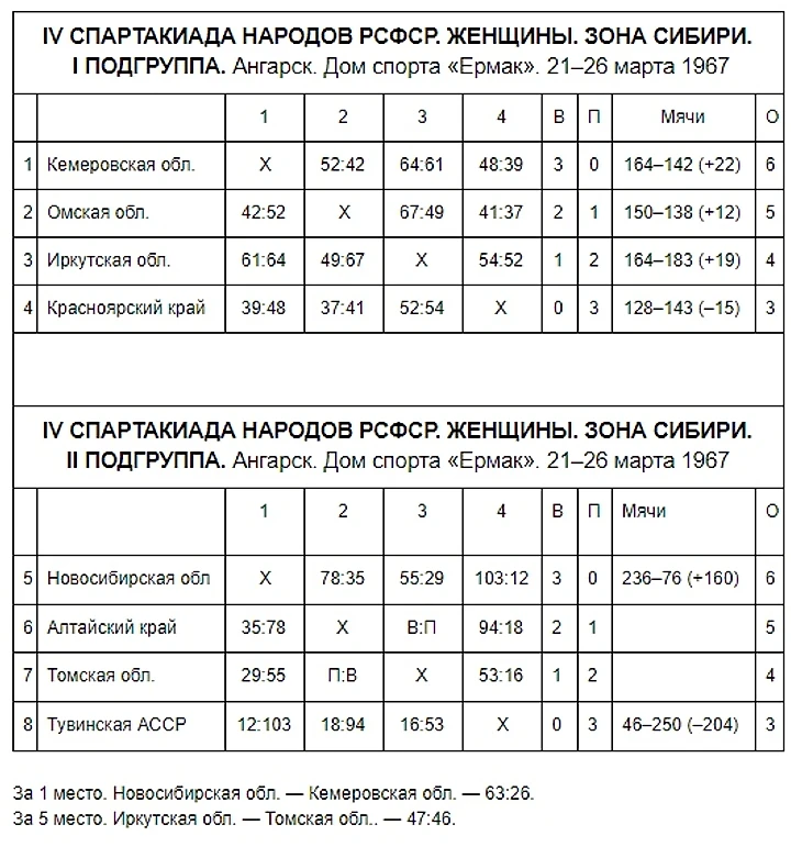 Региональный турнир IV СПАРТАКИАДЫ НАРОДОВ РСФСР среди женщин проходит в ангарском Доме спорта «Ермак». Конечно же, иркутские баскетболистки (капитан Маргарита Вакулич) рассчитывают попасть в финал, ведь на прошлой Спартакиаде 1963 года они были в числе шести сильнейших сборных РСФСР. Но уже в первом матче неудача — поражение от кемеровчанок 61:64. Ну а когда во второй игровой день хозяйки проиграли омским баскетболисткам — 49:67, стало понятно, что Казани (где должен пройти финальный турнир Спартакиады) иркутянкам не видать. Зато ангарские любители спорта увидели в деле по–настоящему классную команду — новосибирское «Динамо» (под флагом сборной своей области), выступавшее тогда в высшей лиге чемпионата СССР. Обратите внимание: новосибирки в матче группового турнира обыграли сборную Тувы с невероятным счетом — 103:12.