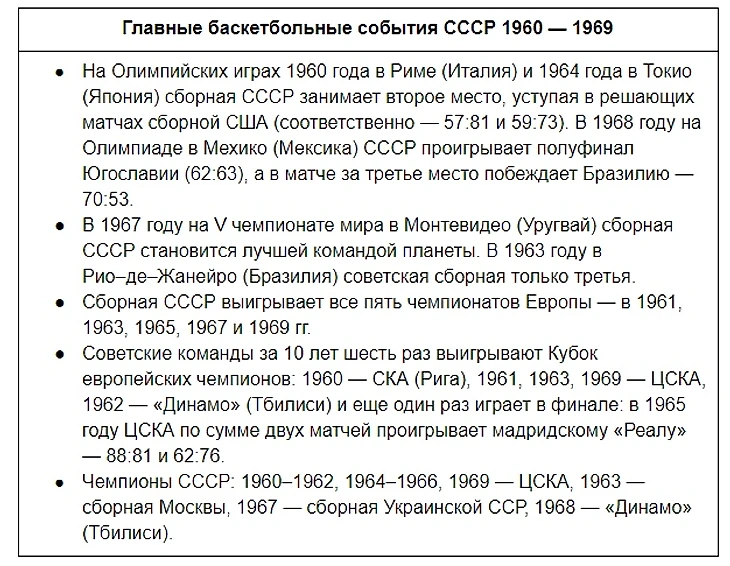 Советская баскетбольная школа в начале 60–х — одна из сильнейших на планете, уступает только американской (напомним — профессионалы тогда на турнирах не играли, США на международных форумах представляли студенческие команды). Да, американцы далеко впереди, но основных конкурентов — Югославию и Бразилию СССР, как правило, побеждает. Самый крупный успех десятилетия — первая победа на чемпионате мира в 1967 году.