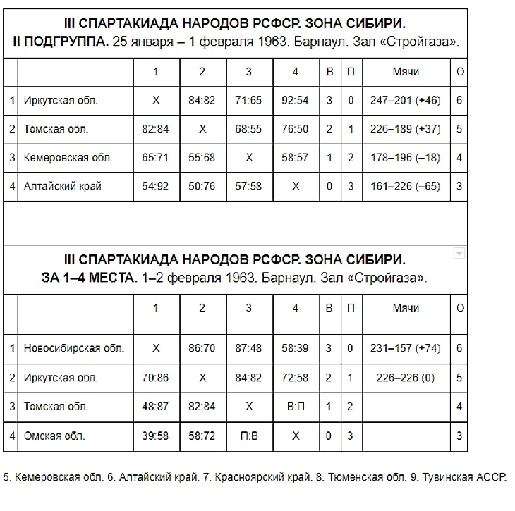 1963. В региональном турнире III СПАРТАКИАДЫ НАРОДОВ РСФСР в Барнауле мужская сборная области последовательно выигрывает у всех соперников. Судьбу первого места и путевки на финальный турнир Спартакиады решал матч со сборной Новосибирской области, к которому соперники пришли без поражений. Увы, иркутяне в очередной раз проиграли своим извечным соперникам — 70:86.