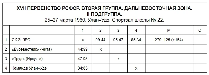 В региональном ПЕРВЕНСТВЕ ДСО «ТРУД» в Чите женская команда Черемхово на голову выше своих соперниц из Улан–Удэ (50:31) и Читы. Лидеры команды — Л. Рябцовская, Р. Харисова, В. Уварова и Г. Маркова. Мужская команда СК «Сибиряк» (Ангарск) выигрывает у Читы, но проигрывает Улан–Удэ.