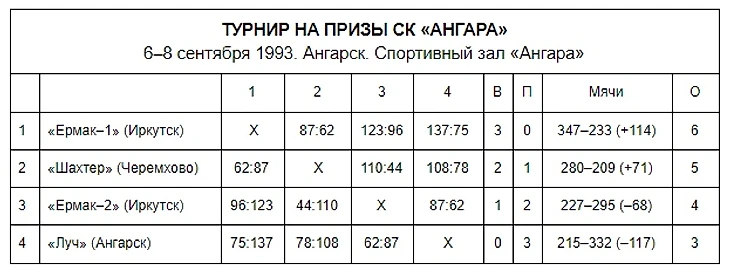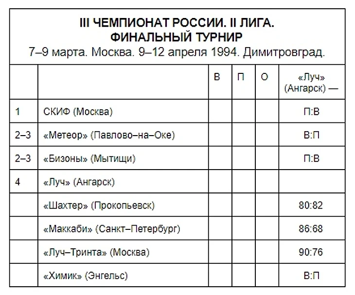 В ПЕРЕХОДНОМ ТУРНИРЕ III ЧЕМПИОНАТА РОССИИ, который проходил в Москве 20–25 мая 1994 года, победил московский СКИФ, одержавший 4 победы в 5 матчах. Ангарчане также одержали 4 победы (над мытищинскими «Бизонами», «Метеором» из Павлово–на–Оке, «Медином» из Нижнего Новгорода и «Мурманом» из Мурманска), но из–за поражения в очном противостоянии со СКИФом заняли второе место.