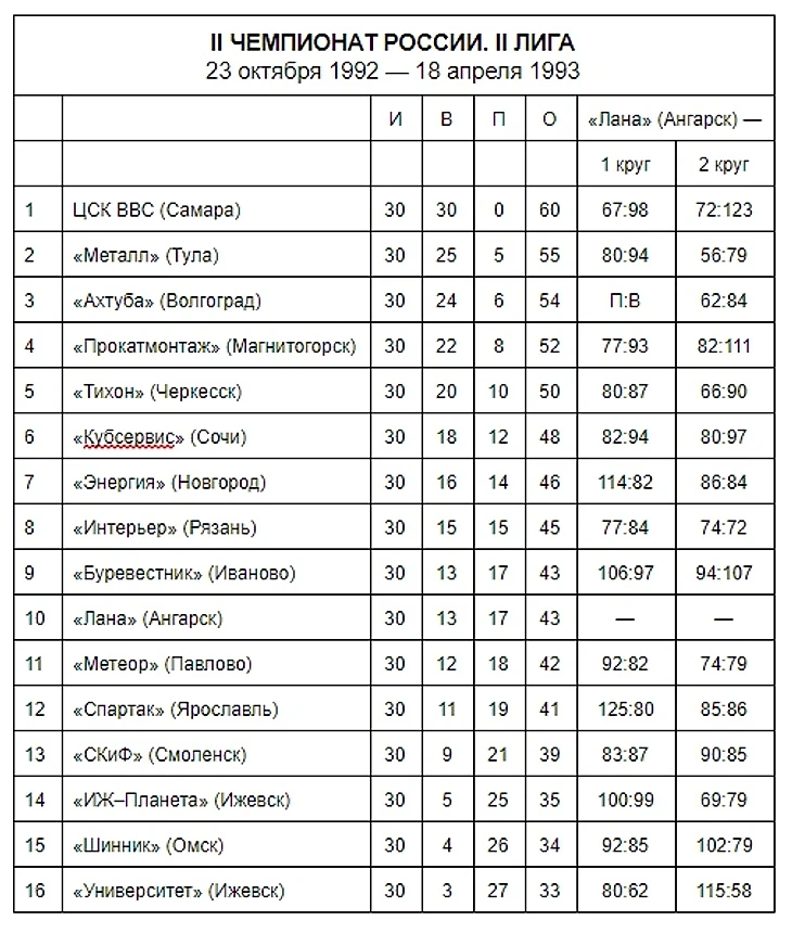 Во II ЧЕМПИОНАТЕ РОССИИ (II ЛИГА) «Лана» стартовала в своем спортзале «Ангара», да сразу с двух побед, проиграв лишь третий матч домашней серии. Этими играми выступления в родном городе для ангарчан и ограничилось — 16 команд играли в два круга турами по замысловатому календарю. В следующем туре в Магнитогорске они проиграли все свои четыре матча (подобное случится и во втором круге в Волгограде). В противовес лучшими для команды были туры в Смоленске (победы в трех из четырех матчей) и Ижевске (две победы в трех играх). В последнем туре «Лане», чтобы занять восьмое место и продолжить борьбу за выход в Первую лигу, необходимо было выигрывать все матчи. Увы... Для решения задачи не хватило двух побед — 10 место. Но едва закончился чемпионат, как стало известно что по решению Федерации баскетбола Первая лига расширяется и повышение получают все команды, занявшие места со 2 по 10 (лидер сезона — самарский ЦСК ВВС — по сути алма–атинский СКА, переехавший на Волгу после развала Союза, и вовсе шагнул из Второй лиги в Высшую).