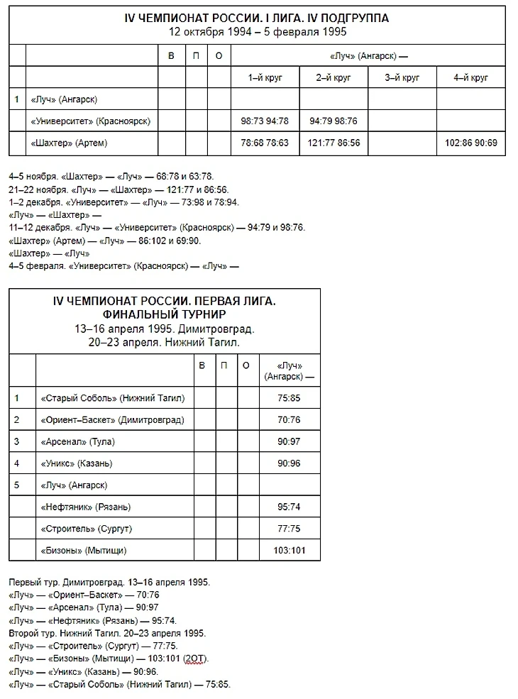 В турнире IV ЧЕМПИОНАТ РОССИИ (I ЛИГА) участвовали 32 команды, разбитые на четыре зоны. В сибирско–дальневосточной группе планировалось участие 4 команд, но якутский «Университет» (ангарчане успели их обыграть дома на самом старте — 127:48 и 135:57) и прокопьевский «Шахтер» с розыгрыша снялись, так что пришлось «Лучу» с двумя его соперниками играть по 8 раз, оспаривая единственную путевку в финал. И на этой дистанции «Луч» был безоговорочно сильнейшим.