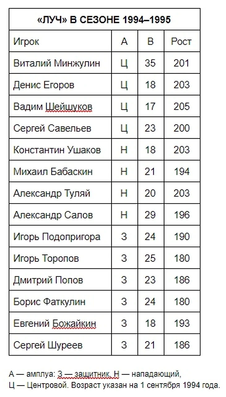 «Луч» в сезоне 1994–1995. Нижний ряд слева направо: Евгений Божайкин, Михаил Бабаскин, Дмитрий Попов, Борис Фаткулин, Игорь Торопов, Иван Букаенко. Верхний ряд: Виталий Минжулин, Вадим Шейшуков, Игорь Подопригора, Сергей Савельев, Владимир Иванович Тыщенко (старший тренер), Александр Туляй, Сергей Владимирович Наханович (начальник команды), Константин Ушаков, Александр Михайлович Брызгалов, Денис Егоров, Александр Салов.