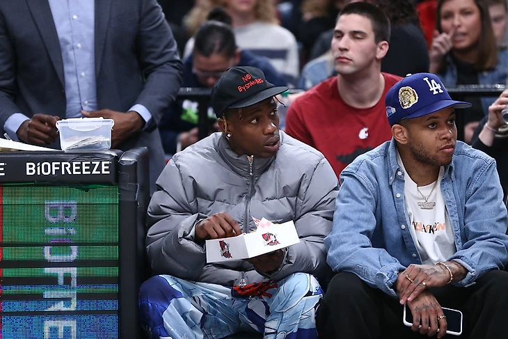 Минувшей ночью Трэвис Скотт и его близкий друг и DJ Chase B посетили домашнюю игру «Портленда» в рамках регулярного сезона НБА — «Блейзерс» встречались с «Атлантой».
