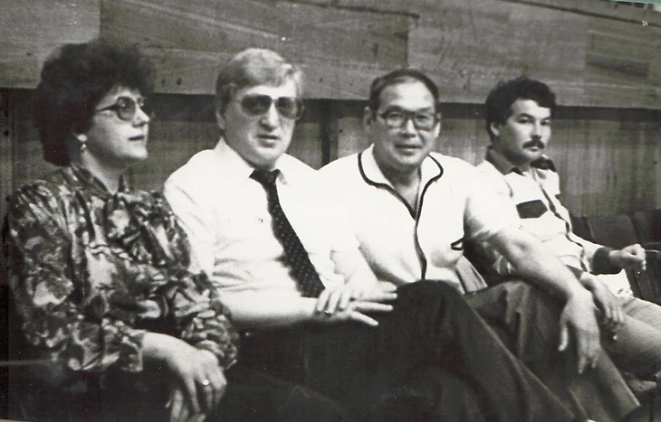 Иван Михайлович Щадов с супругой на матче «Шахтера» в иркутском Дворце спорта в 1989 году. Справа – известные иркутские тренеры братья Тепловы: Владимир и Сергей