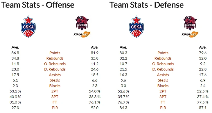Разница набранных-пропущенных очков не только позволила Басконии квалифицироваться в плей-офф, но и стать 6-й лучшей командой по итогам 30 игр регулярного чемпионата (ЦСКА 3-я лучшая разница). Особенно обнадеживающе в преддверии старта плей-офф выглядит разница в -1 очко, полученная по итогам двух встреч с ЦСКА – оба раза Баскония пробивала в играх против армейцев предложенную букмекерами фору. Более того, оба матча между командами прошли значительно ниже предложенных букмекерами тоталов – как минимум 10 пунктов (матч в Москве) клубы не добирали относительно предматчевых раскладов. Учитывая высокий градус противостояния в рамках встречи плей-офф, вариант ставки на Тотал меньше (166.0) в первой игре между командами выглядит весьма приемлемо. Впрочем, не верится и в крупное поражение Басконии, баскетболисты которой спят и видят себя в домашнем турнире «Финала Четырех»! Оба клуба выступают в среднем по меркам Евролиги темпе (Расе), но испанцы выделяются более эффективной обороной (DefRtg), о чем свидетельствует меньшее количество пропущенных очков в целом. Защита Басконии 6-я самая эффективная в Евролиге, что в решающих играх сезона дает немалое преимущество (у ЦСКА 10-я самая эффективная):