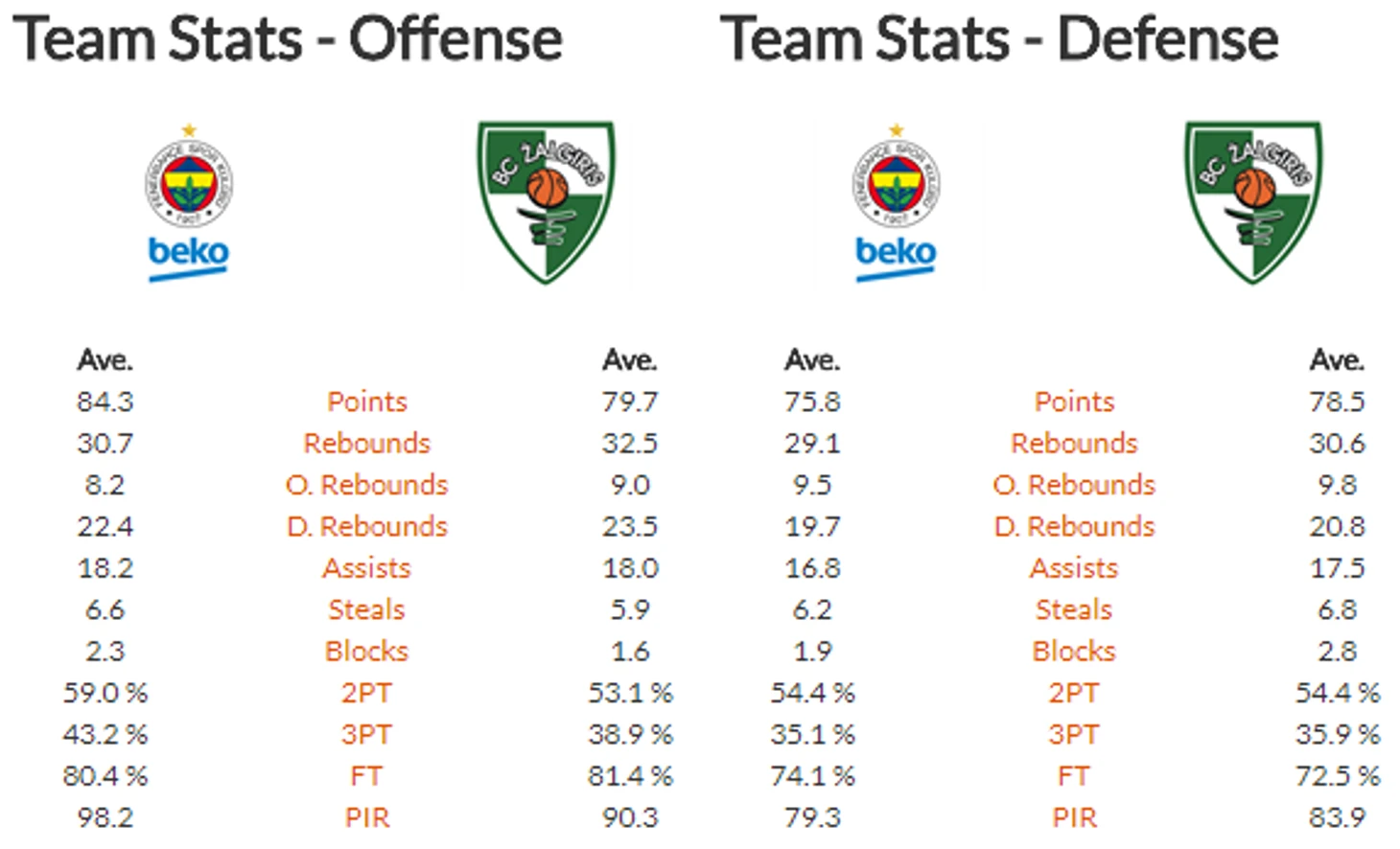 Несмотря на то, что Фенербахче может похвалиться наименьшей средней пропускаемостью среди всех 16-ти команд Евролиги (74.6 очка за игру), стамбульский гранд занимает лишь 7-е место среди наиболее эффективных защитных команд. Результат со столь низкой пропускаемостью достигается в первую очередь благодаря самому низкому в Евролиге игровому темпу, причем с громадным запасом – показатель Расе 66.9 владений на целых 2.0 владения меньше, нежели у идущей второй по этому компоненту Баварии. Особенно ярко выражается навязывание сопернику неудобного вязкого баскетбола в матчах на «ULKER SPORTS AND EVENT HALL», где лишь экстра-эффективное нападение позволяет удерживать результативность на должном уровне. В гости к Фенербахче едет вторая наименее результативная гостевая команда регулярки – меньше чем у Жальгириса (153.5 очка за игру), результативность выездных встреч только у Олимпиакоса (150.1). Да к числу коллективов, которые своими действиями на паркете способствуют ускорению игрового темпа, Жальгирис отнести никак нельзя – литовцы играют в 3-м самом низком темпе среди всех участников Евролиги этого сезона. Вариант ставки на на Тотал меньше (152.0) напрашивается сам собой. Но и фору на победу хозяев предлагают весьма внушительную – в стол принципиальном противостоянии не сильно верится в победу хозяев с двузначной разницей в счете.