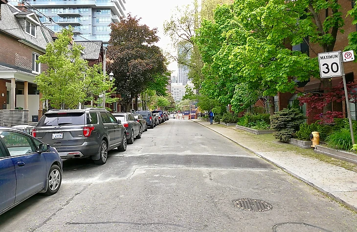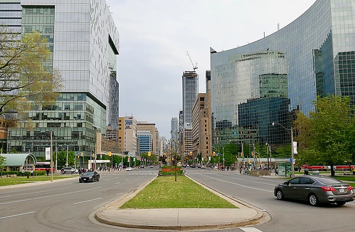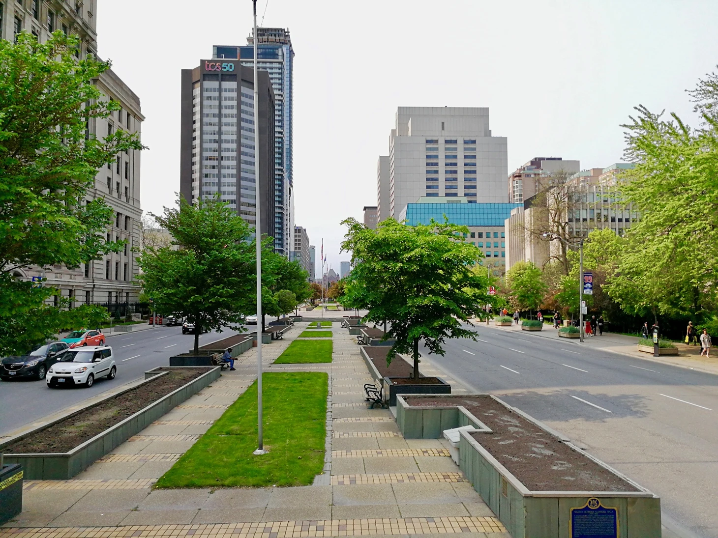 Юниверсити авеню. Здесь множество госпиталей, исследовательских центров и на севере улицы Квинс Парк – дом правительства провинции Онтарио. Вид на север.