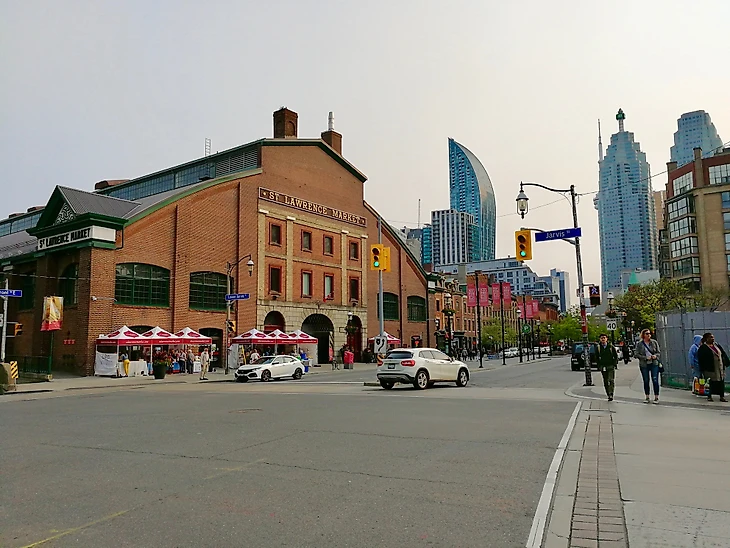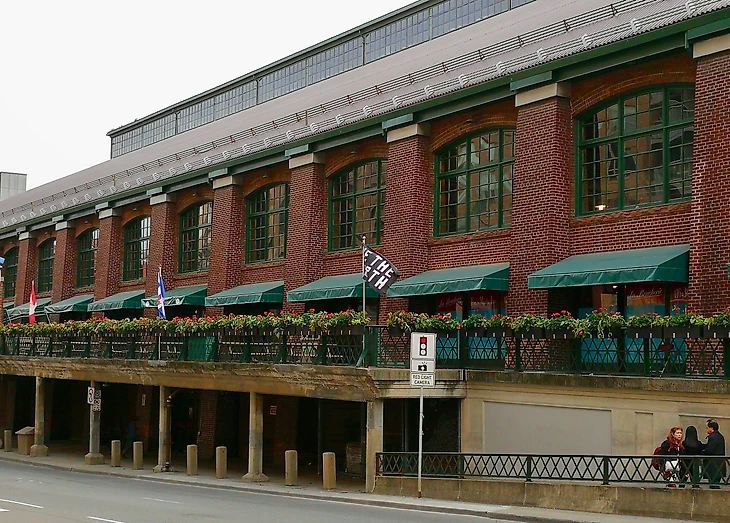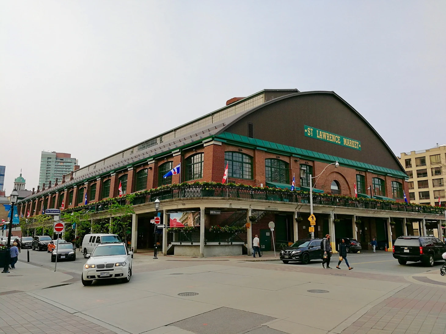 И на здании южной части рынка Сэнт-Лоуренс. Рынок существует с 1803 года. Здание южной части было возведено в 1845, но с тех по было дважды перестроено. Северную часть снесли в 2016, чтобы построить более современное помещение, которое обещают построить к 2022 году.