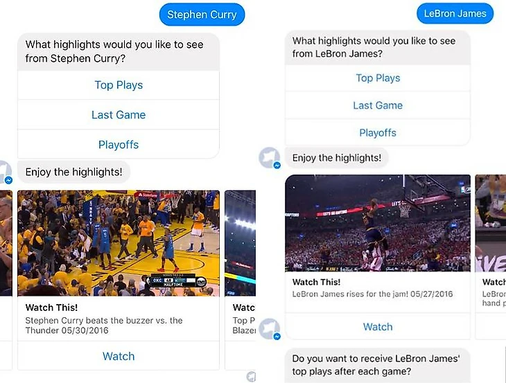 Тот же метод помогает НБА взаимодействовать с аудиторией напрямую: перед финалом-2016 лига запустила бота в мессенджере фейсбука, который присылает пользователям в том числе хайлайты по запросу. Например, бот спрашивает о любимом игроке, затем предлагает выбрать, какие именно моменты с его участием болельщику больше интересны (из предыдущей игры, вообще лучшие за сезон или именно в плей-офф) и отправляет как раз их. А затем предлагает подписку на нарезки с участием этого игрока – они будут приходить в мессенджер после каждого матча.