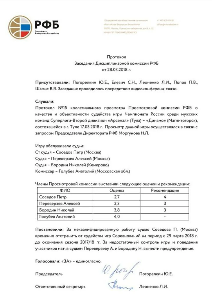 Кроме того, «Арсенал» опубликовал еще и протокол Дисциплинарной комиссии РФБ после матча с магнитогорским «Динамо». Из него следует, что вину за то, что на площадке остался один игрок тульской команды, возложили на судей и никакого предупреждения тогда тульский клуб не получал.
