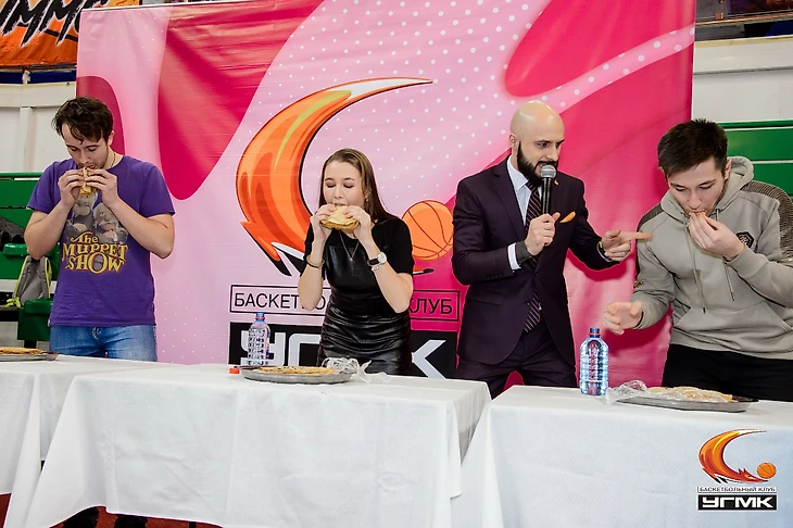 На «закуску» в большом перерыве матча состоялся очень вкусный конкурс «Ешь блины, пока можешь». Суть очень проста: тот, кто осилит большее количество блинов за минуту, забирает приз. На сцену вызвались трое участников: двое юношей и одна хрупкая девушка. Безоговорочную победу и сытость на удивление многих уверенно унесла с собой представительница «слабого пола».