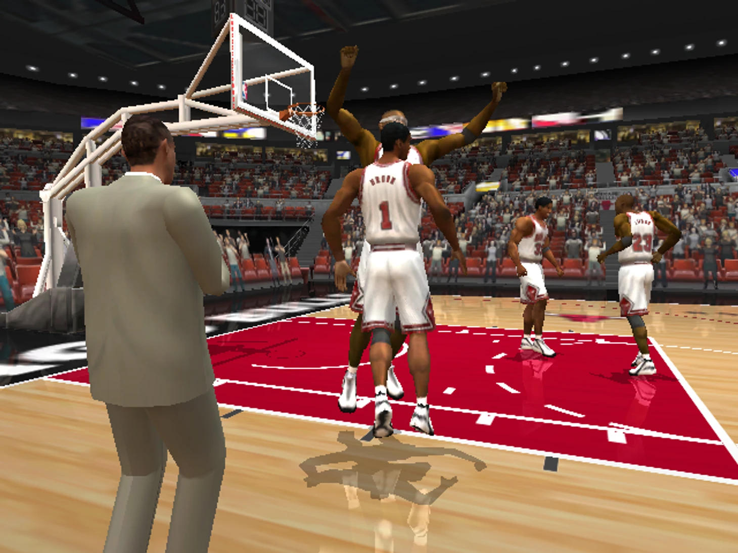 Игру я выровнял, и вот так разыграл решающий трехочковый за 25 секунд до конца (и с сиреной об окончании времени на атаку). Опять же, довольно стандартно для NBA Live 2003 – уйти на средний, забрать с собой второго опекуна, поднять соперника в воздух, откинуть свободному игроку. Правда, не всегда этот свободный игрок оказывается за спиной, чтобы найти его короткой передачей, часто он уже где-нибудь в углу, куда мяч не долетит. Ну и попасть надо. Тут все совпало: