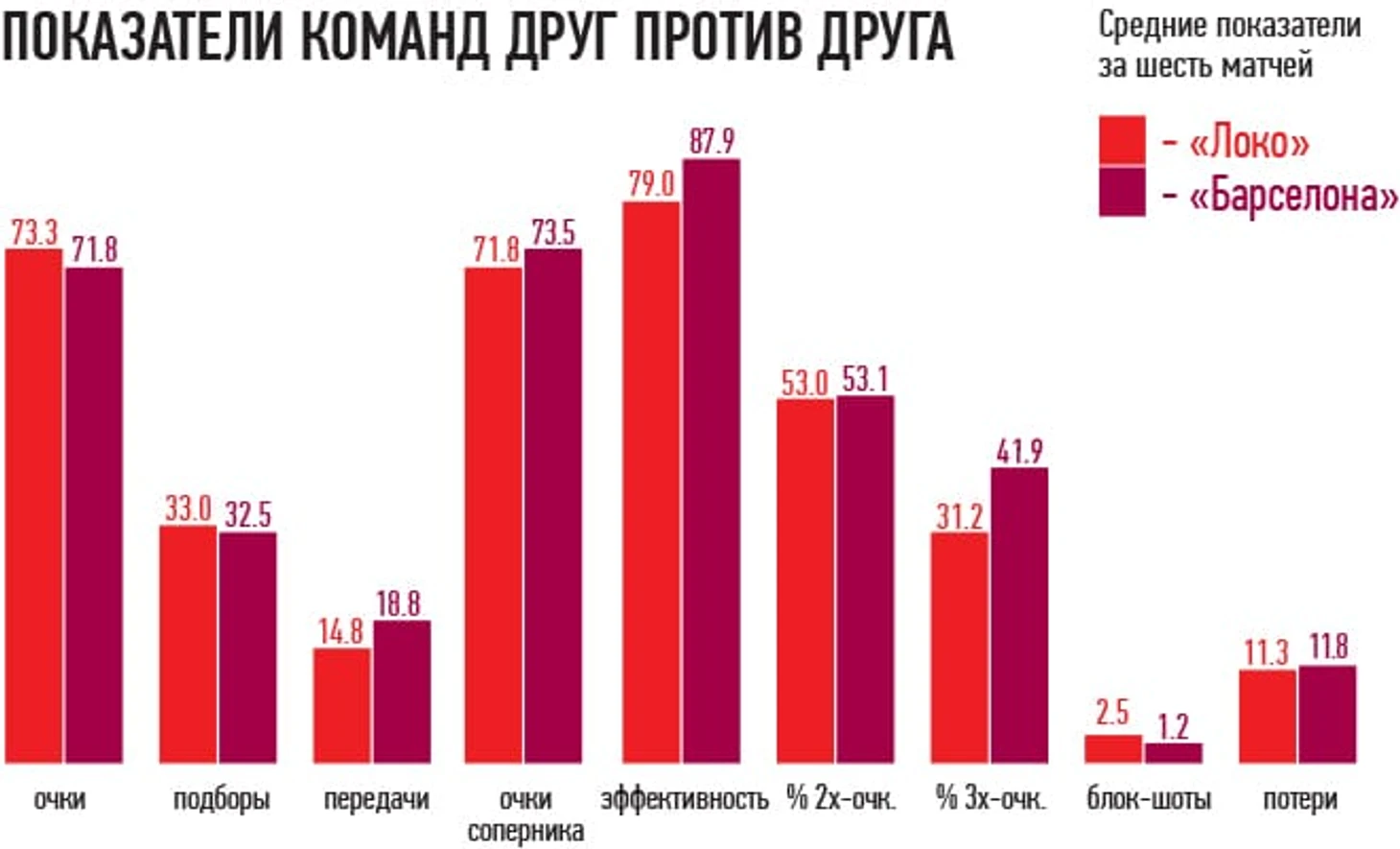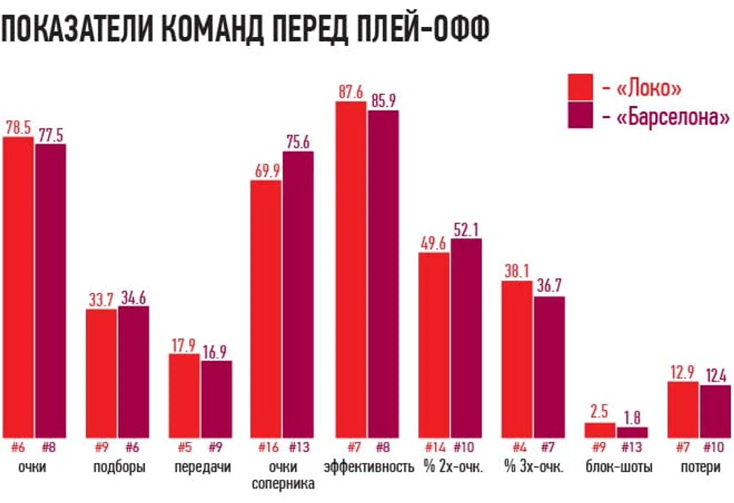 Забавно, как статистика исправляла представление о столкновении защиты и нападения, воплощенных в тех «Локо» и «Барселоне». Цифры говорят нам, что атака каталонцев как была хуже, чем тогда у «Локо» до плей-офф, так и осталась. В трех проигрышах «сине-гранатовые» в среднем бросали трехочковые с эффективностью 29%. В самой первой встрече «Локо» сдерживал соперника первые 32 минуты, и тот закончил с процентом 26,3%, хотя и победил.