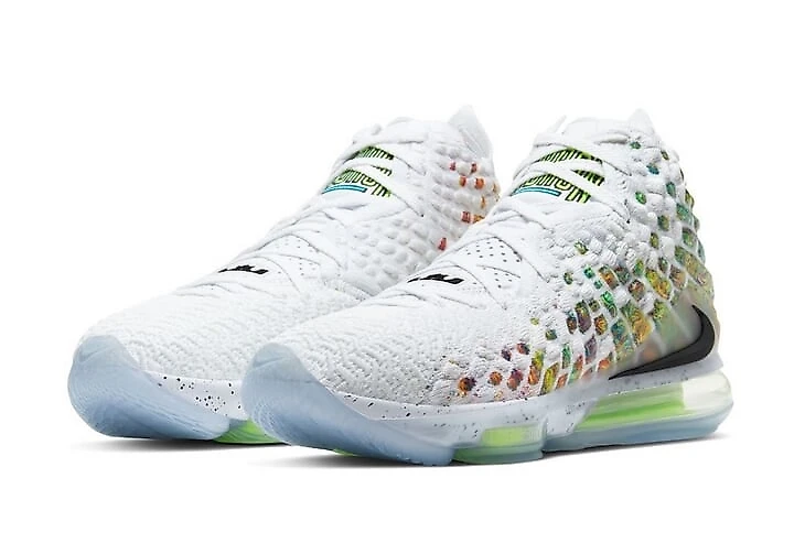 Модель LeBron 17 повторяет цвета оригинальных хайтопов, а разноцветные вставки отсылают к стилю одежды персонажа Вуди Харрельсона. Уникальность кроссовка в том, что вместо стандартного изображения льва на язычке появилась винтажная надпись LEBRON.
