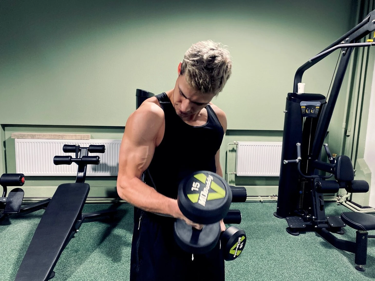 🔹Гантели сидя с полным разгибанием локтя (тренировка бицепсов) — три подхода по 12 раз;