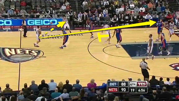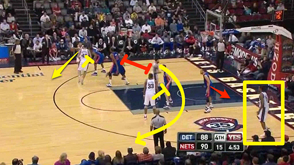 В напряженном матче с «Детройтом» «Нетс» повели два очка за пять минут до конца. Владение было у «Нью-Джерси», и команда Эвери Джонсона постаралась довести до ума комбинацию, рассчитанную на использование сильных качеств разыгрывающего Дерона Уильямса. Им удалось вывести того на открытый трехочковый бросок.
