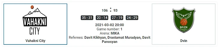 Игра завершилась со счетом 106:93 в пользу Ваагни Сити. Как я уже сказал, все выглядело так, будто игроки Ваагни не столкнулись с какими-то серьезными проблемами в этой встрече, и даже без особого вмешательства некоторых лидеров, например Альберта Татевосяна, который набрал всего 8 очков, Ваагни сумели одержать победу. К слову, если Двин сумеет выиграть хотя бы одну игру, то серия затянется минимум до 4-х встреч, а учитывая то, что игроки Ваагни играют практически без отдыха, - это увеличивает шансы Двина на победу в серии. Будем надеяться, что Двин подготовятся к следующей встрече лучше, и смогут противопоставить сопернику нечто большее, чем сегодня, ну а пока у Ваагни больше желания и рвения к чемпионству.
