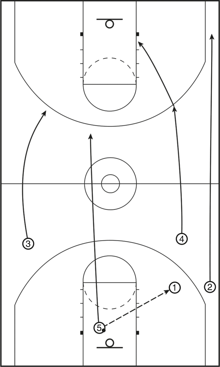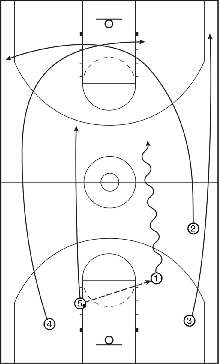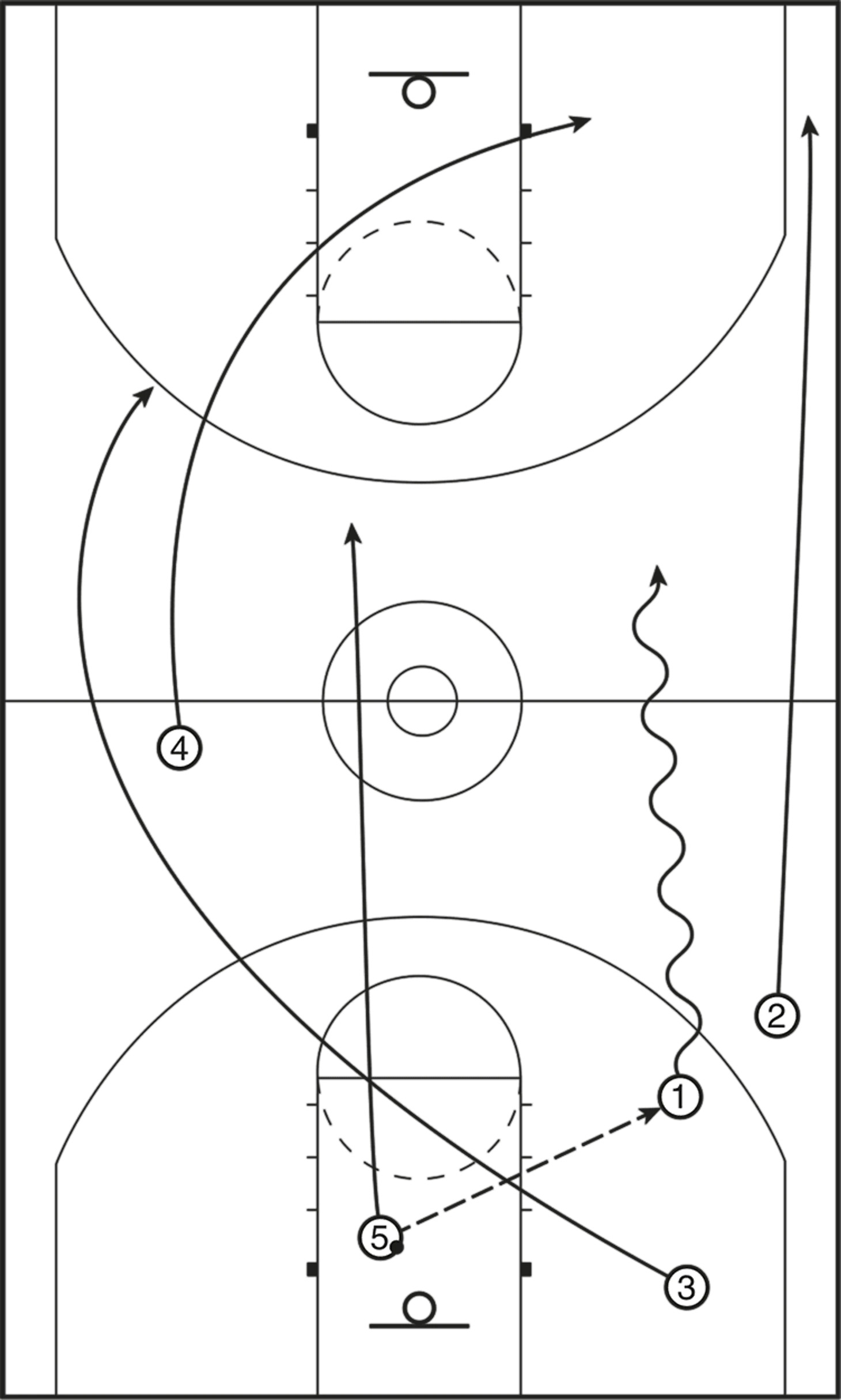 Сопровождающий игрок впереди мяча в боковом коридоре. 4, один из сопровождающих игроков, находится впереди мяча, занимая боковой коридор. Он бежит вперед, чтобы получить мяч и выполнить бросок из-под корзины. Если он не может получить мяч и выполнить бросок, находясь в коридоре, то он занимает позицию центрового на сильной стороне, в то время как 2 и 3 бегут по боковым коридорам, а 5 выступает в качестве сопровождающего игрока (рис. 3).