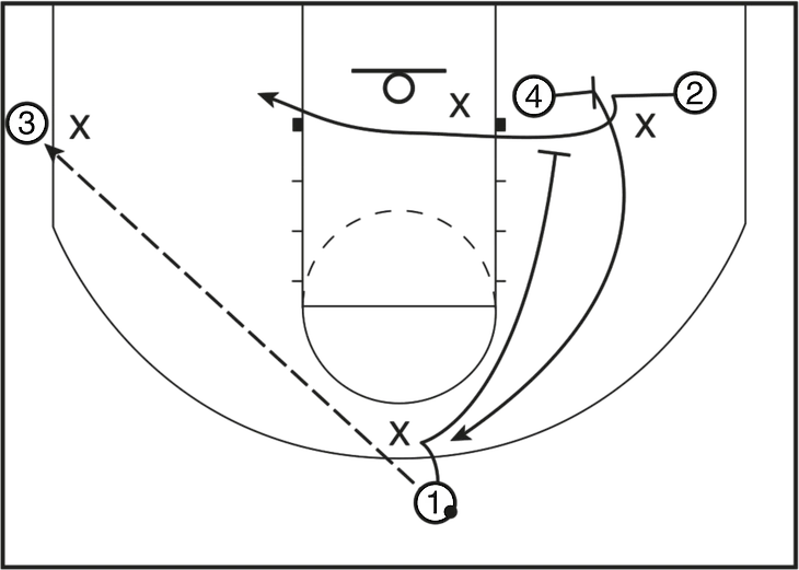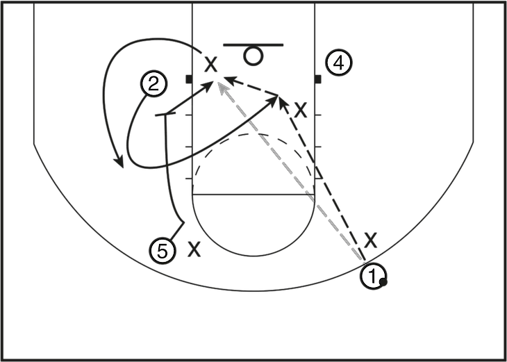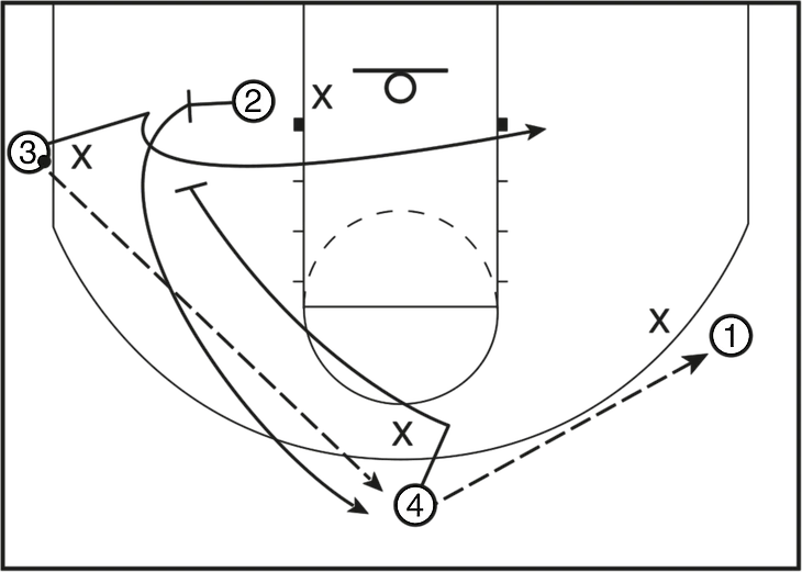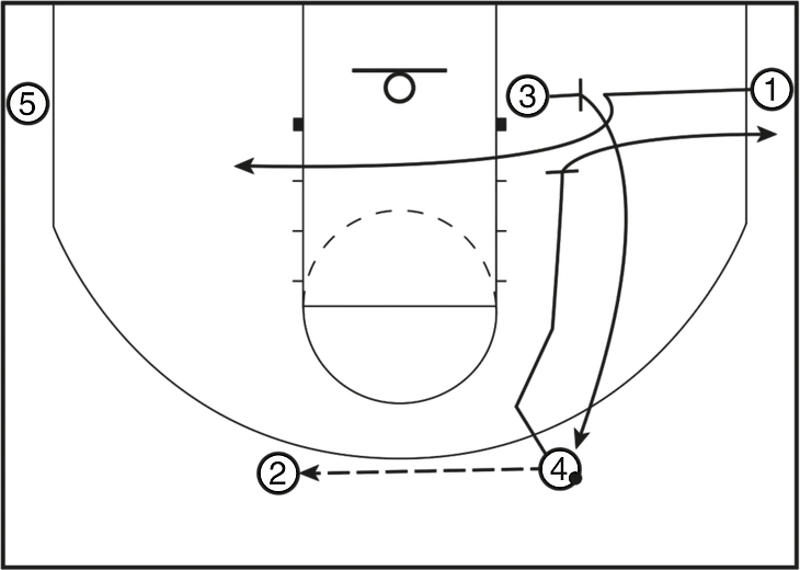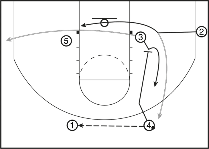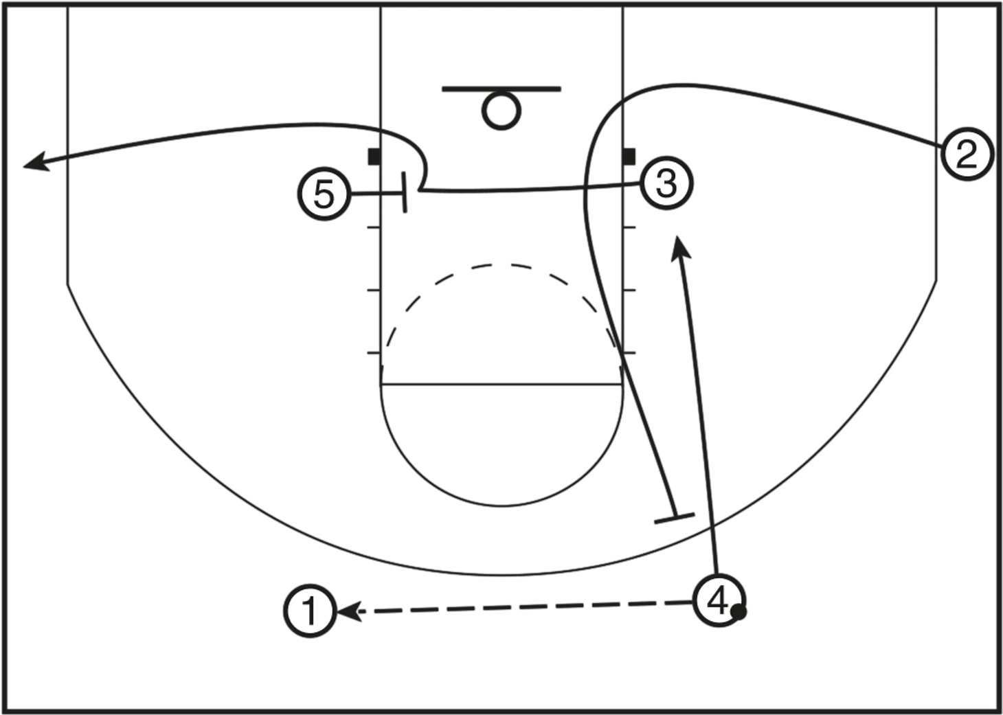 • мяч 4, выходящему из-за заднего заслона, поставленного 2;