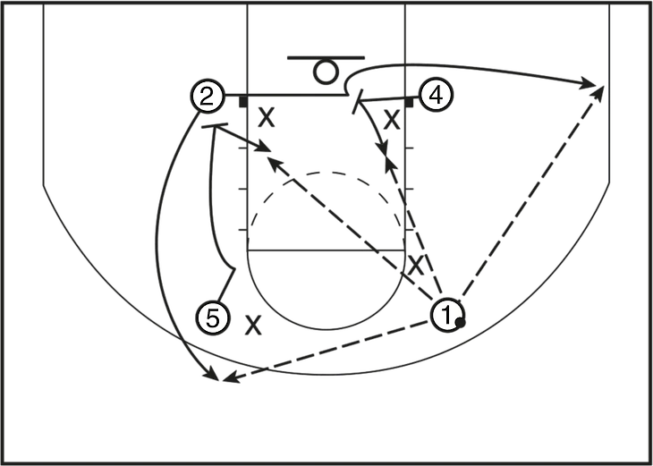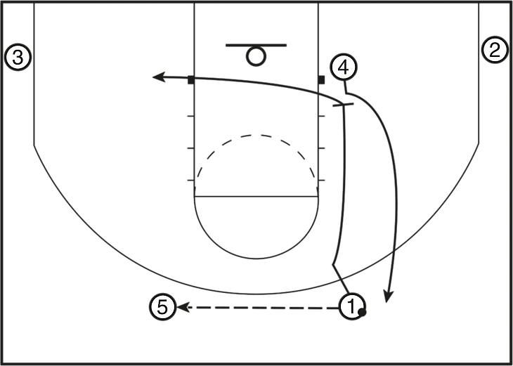 Вместо перевода мяча на другую сторону площадки 5 выполняет обратную передачу 1, который открылся, в то время как 4 направляется в ограниченную зону, чтобы принять мяч от 1 и сыграть один на один против своего защитника (рис. 18).