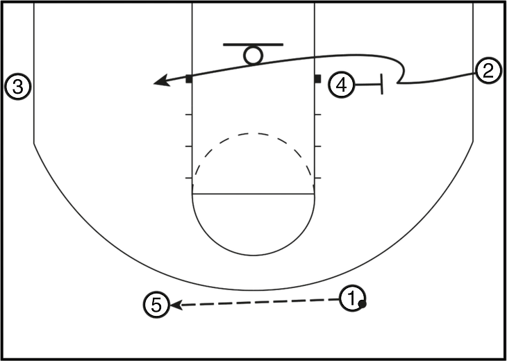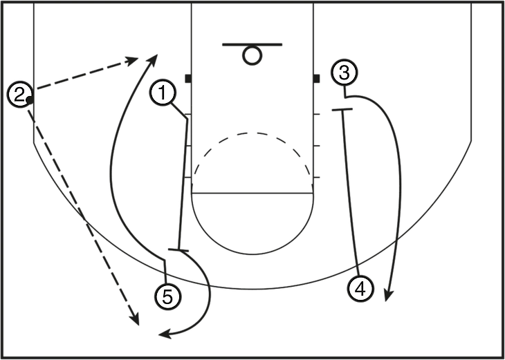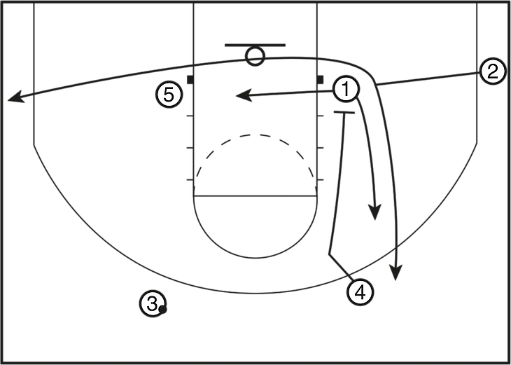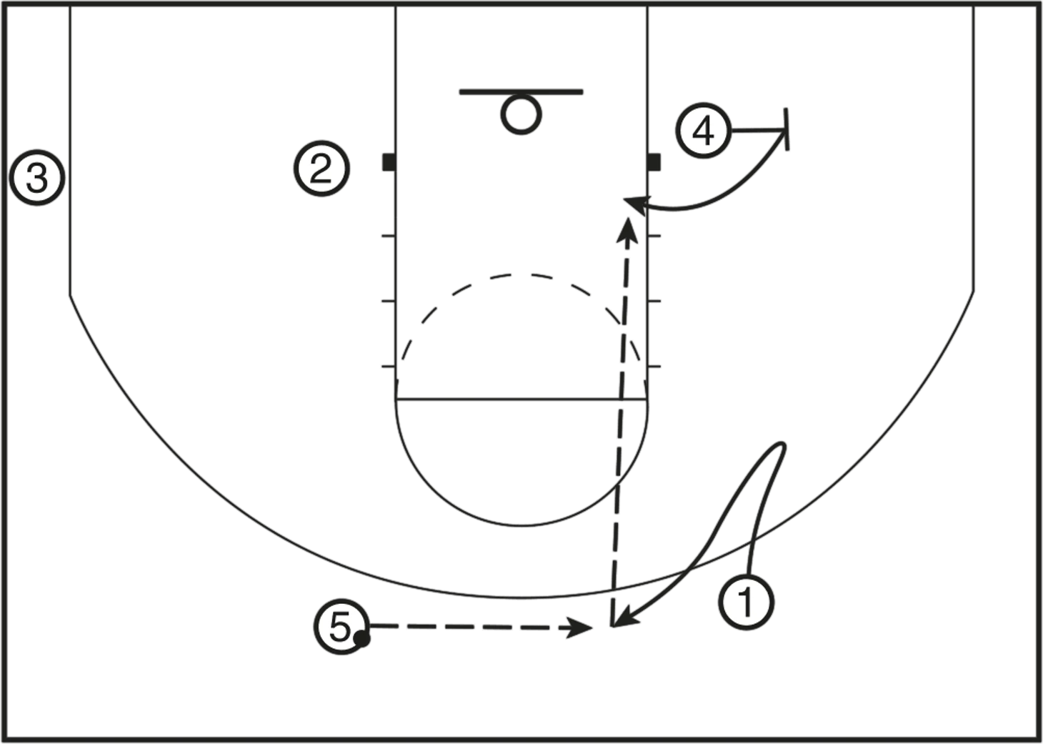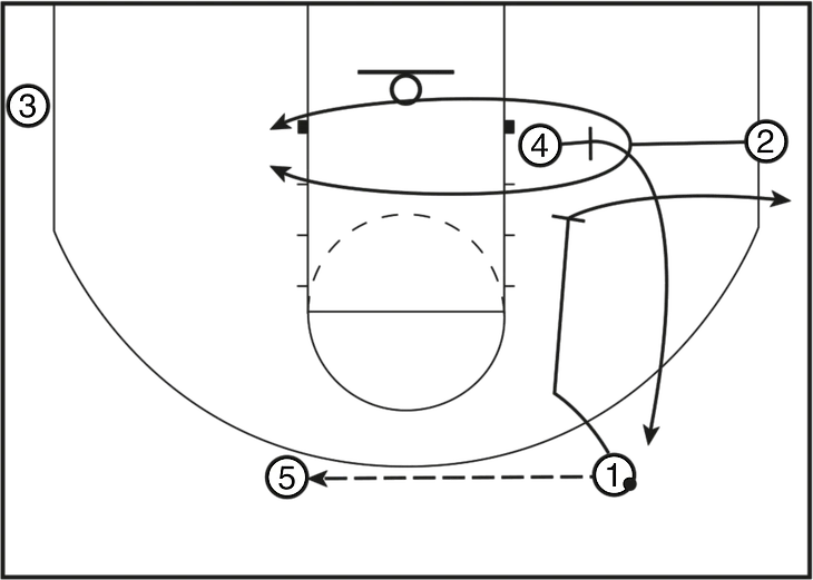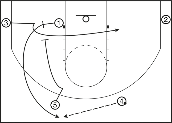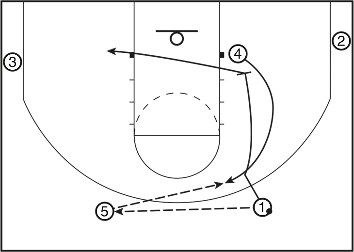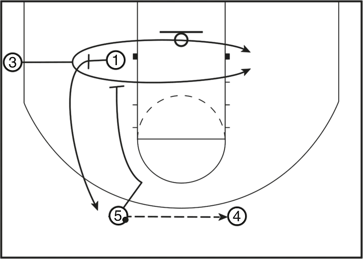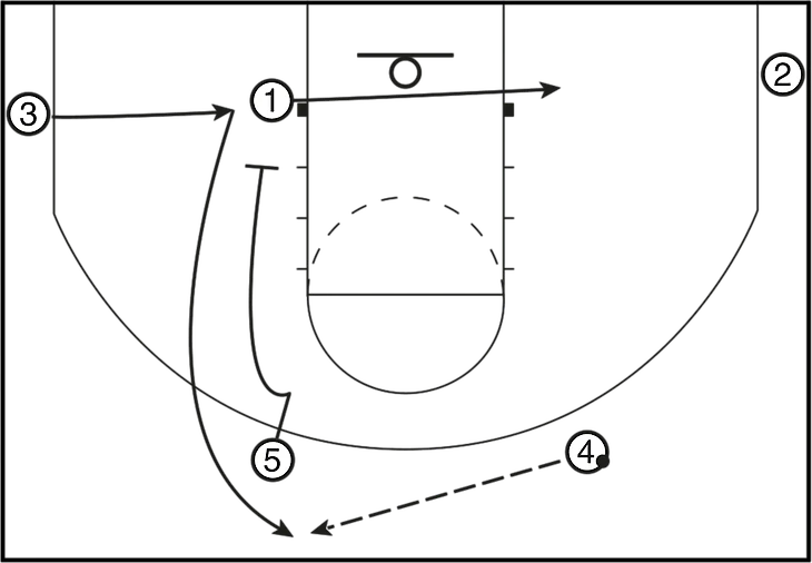 • передать мяч 5, который использует задний заслон, поставленный 3;