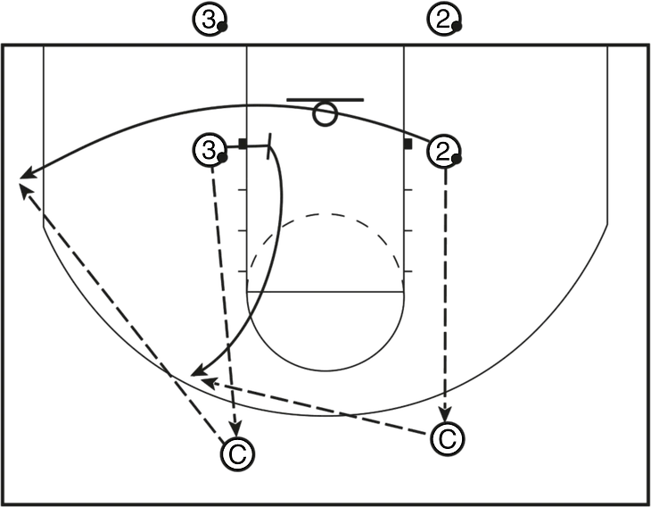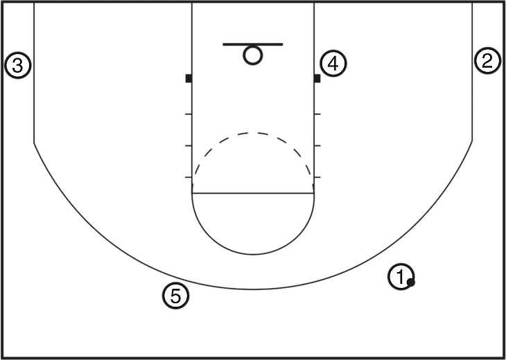 Два игрока занимают один коридор у боковой линии на сильной стороне площадки. Например, если 2 и 3 занимают один боковой коридор, а мяч ведется по тому же коридору позади них, то передний игрок (в данном случае 2) продолжает движение и делает рывок под корзиной, уходя в противоположный угол. 3, который находится за 2, остается в коридоре и занимает позицию в углу на своей стороне площадки. В это же время 4, форвард в боковом коридоре на другой стороне, делает рывок в трехсекундную зону, чтобы получить мяч. Не получив мяч, он занимает нижнюю позицию (данное правило действует для первого сопровождающего игрока), а 5 выступает в качестве второго сопровождающего и останавливается, не доходя линии 3-очковых бросков (рис. 1).