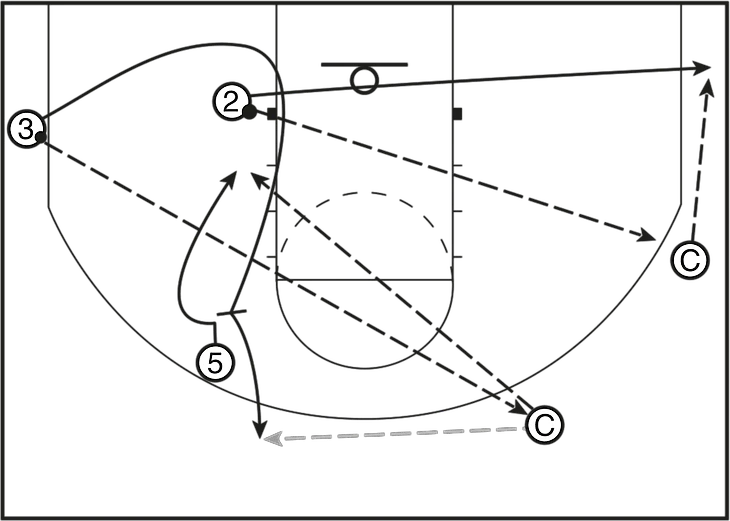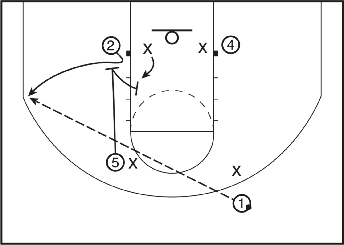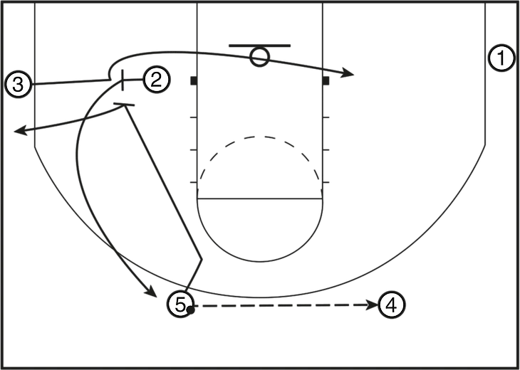 • передать мяч 5, который разворачивается к корзине после выполнения заслона для 3.