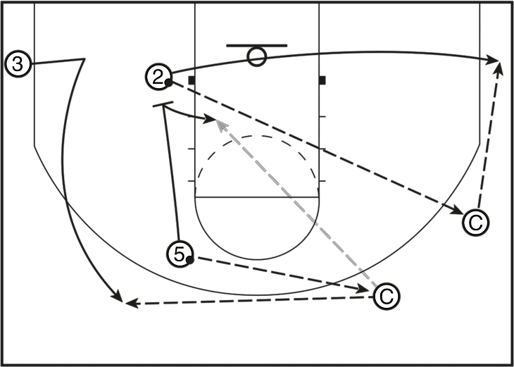 Аналогичные действия на другой стороне площадки выполняет 5, который передает мяч 4. 2 ставит задний заслон для 3 и получает заслон от 5 (маневр «заслон для заслоняющего»), который выполнил заслон для 3, затем 5 уходит наружу (рис. 6). У 4 есть два варианта действий: передача мяча 3 внутрь трехсекундной зоны или передача 2, который выходит из-за заслона, поставленного 5.