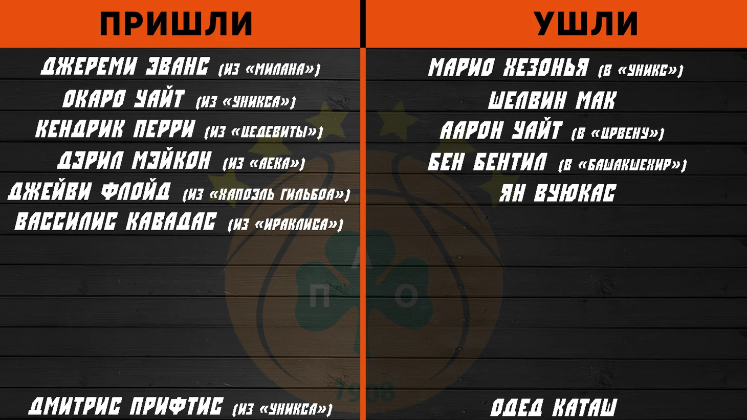 Греки без каких либо проблем забирают титул чемпионов Греции уже 5 лет кряду. И если раньше были зарубы хотя бы со Спанулиссом и Ко, то теперь тоска смертная по накалу во внутреннем чемпионате. В Евролиге афинский клуб звезд не хватает уже приличное количество времени. А хотелось бы увидеть вновь европейский гранд на былых высотах. Для этого пригласили хорошо себя проявившего на посту главного тренера УНИКСа Дмитриса Прифтиса. Дмитрис возвращается на родину спустя четыре года, прихватив с собой Окаро Уайта. Ну и, конечно же, попросил сразу несколько американцев в свой состав (Флойд, Мэйкон, Перри). Вот только опыт выступления в Евролиге есть лишь у Окаро Уайта. Главное, что удержали лидеров: Недович и Папапетру переподписали соглашения. Хотя второй держал в уме мысль перебраться за океан. Команду перетрясли знатно в связи с приходом нового тренера, и тот факт, что Хезонья не задержался, даже не удивляет, несмотря на то, как его встречали в середине сезона болельщики в аэропорту.