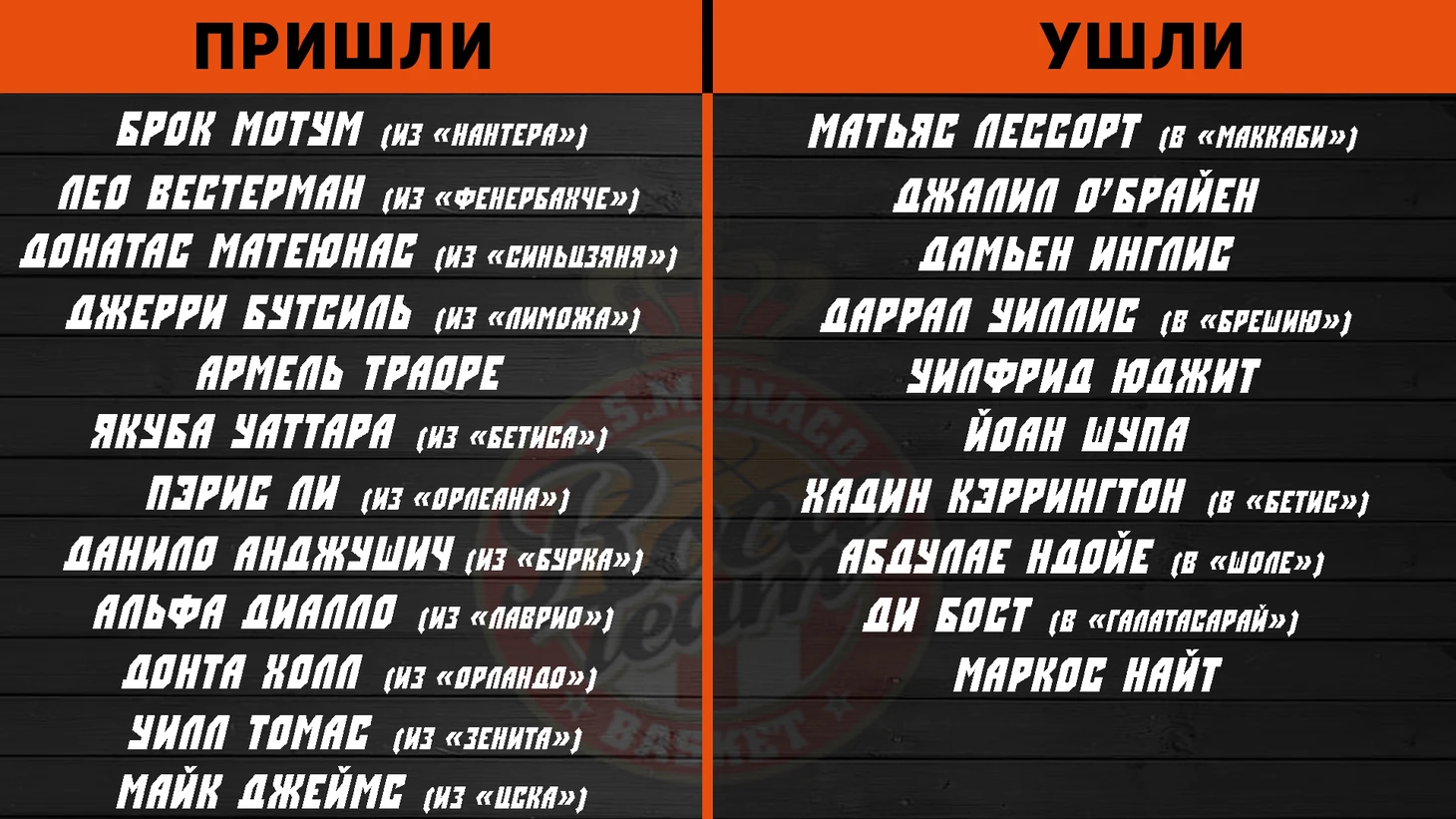 Клуб усилился большим количеством игроков, как и УНИКС. Поскольку оба клуба пошли на повышение, то и соответственно перетасовали свои составы существенно. Приобретенные Лео Вестерманн и забытый многими Донатас Матеюнас явно представляют усиление. После подписания Брока Мотума спустя время пришли новости о подписании соглашения с опытнейшим Уиллом Томасом. А еще спустя время как только трансферный рынок немного притих, ЦСКА разорвал трудовое соглашение с лидером команды последних пару лет – Майком Джеймсом, а Монако оперативно среагировал и подписал американца. Вот это и является следующим шагом, который позволяет клубу бороться за выход в стадию плей-офф. Гарантированный контракт на следующий сезон есть лишь у Роба Грея в составе всего коллектива, а это говорит, что клуб попытается выстрелить здесь и сейчас и терять ему нечего. К клубу присоединился также знакомый многим Данило Анджушич, который прежде выступал за УНИКС, «Парму», а также национальную сборную Сербии. Хороший шутер, который не избалован большим временем на площадке. Существенный минус, что «Монако» потерял Матьяса Лессорта, и пару классных скореров в лице Ди Боста и Маркоса Найта.