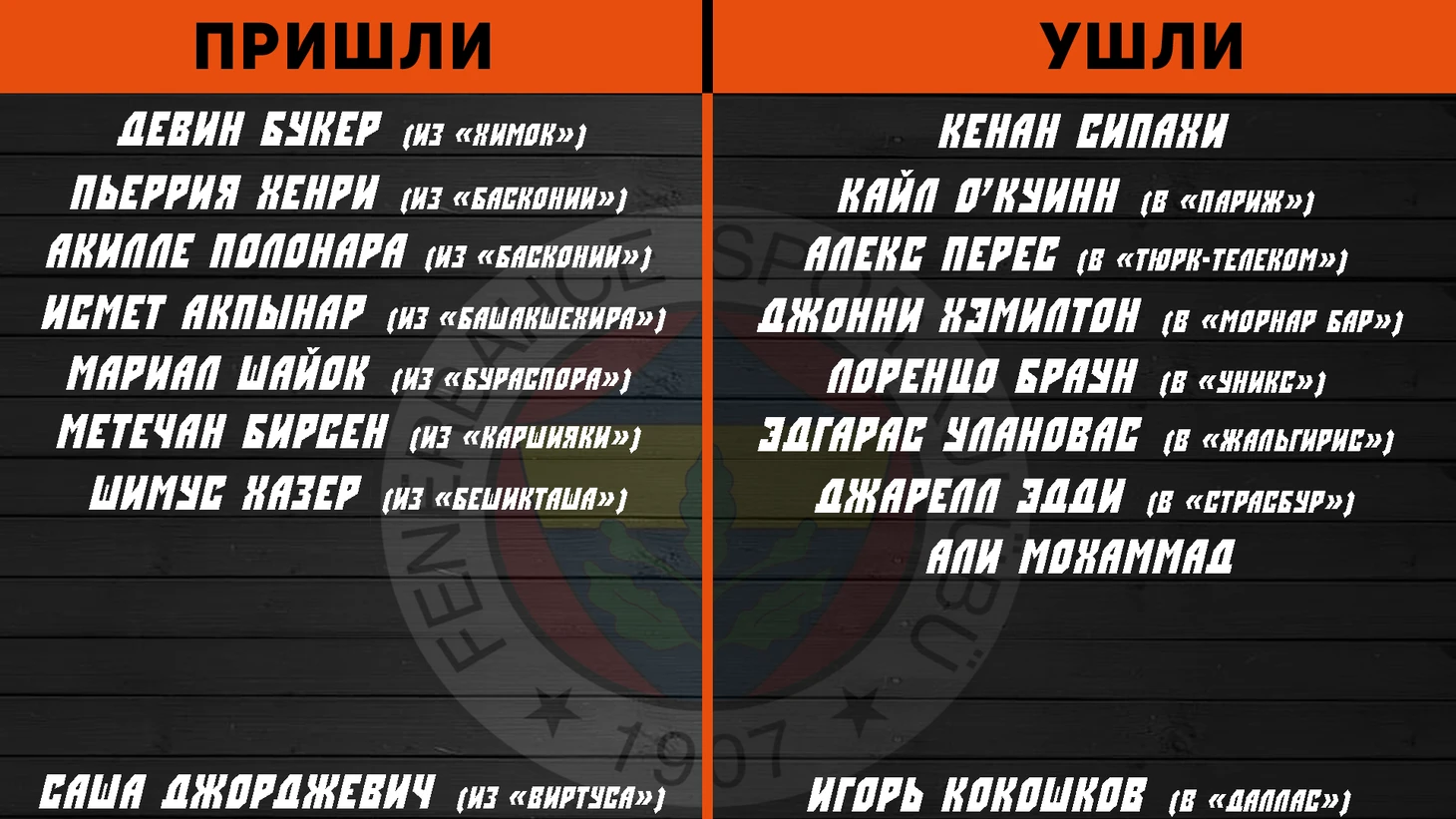 Подопечные Эргина Атамана провели на удивление неплохое межсезонье. Им удалось удержать игровых лидеров в команде, за исключением Сертака Шанли. Турецкий бигмен хотел попробовать свои силы за границей, а вариант с «Барсой» был для него приоритетным, поэтому все сошлось, так как Ясикявичуса тоже улыбает такая возможность поработать с Сертаком. Так же казался неизбежным отъезд Василие Мицича в НБА, но он все же решил остаться в стамбульском клубе, подписав контракт 1+1+1, за срок которого он заработает более 16,5 млн евро. (рекордная сумма). Контракт подразумевает возможность отъезда Васи в НБА после каждого сезона, на что непременно рассчитывает 27-летний игрок, которого мы считаем лучшим на данный момент в Европе. Кто мог продлиться – продлился. Чемпионы Турции и Европы как-никак, куда еще можно желать попасть. Вкратце – Шанли заменили Филиппом Петрушевым (MVP Адриатической лиги прошедшего сезона в составе «Меги»), которого выбрала «Филадельфия» под 50 пиком на драфте НБА, но не подписала с ним контракт.