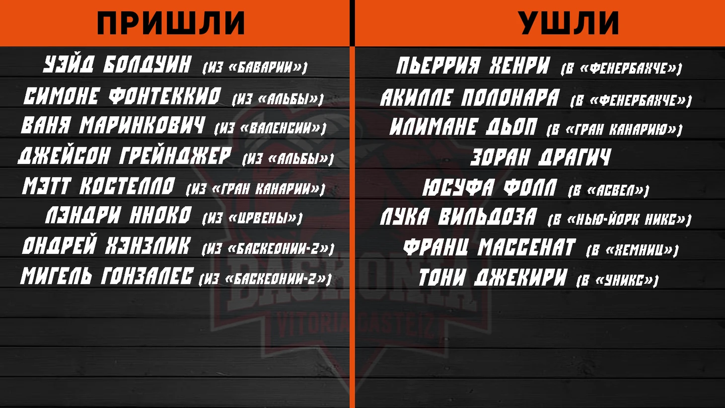 Испанский коллектив под руководством Душко Ивановича не попал в плей-офф в прошлом году, но очевидно метит в следующем. Баски не сумели удержать двух своих лидеров (Хенри и Полонара), но укрепились одним из сильнейших игроков берлинской «Альбы» – Симоне Фонтеккио (которого называют многие специалисты самым недооцененным активом на рынке этим летом) и мюнхенской Баварии – Уэйдом Болдуином. Возвращение Грэйнджера не кажется уже суперусилением, учитывая сколько он пропустил в прошлом сезоне. На замену ушедшим Диопу, Полонаре, Фоллу и Джекири пришли Мэтт Костелло из «Гран-Канарии» (12,2 очка и 5,5 подбора за игру) и Лэндри Нноко («Црвена Звезда»). Если потерю Вильдосы баски как-то компенсировали, то достойно заменить бигменов у «Басконии» едва ли получилось. Незаслуженная четверка, так как сильнее команда не стала. И еще лишь потому, что хочется верить в вечный потенциал Гедрайтиса и Седекерскиса.