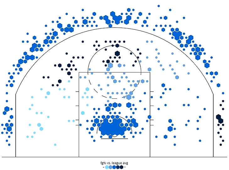 Причем бросковая форма Адебайо выглядела всегда неплохо, кисть мягкая, механика ровная, но пока он прогрессирует мелкими шажками. Средняя дистанция его атак увеличивается каждый год – но, начав с 130 сантиметров, он дошел только до 231 сантиметров.