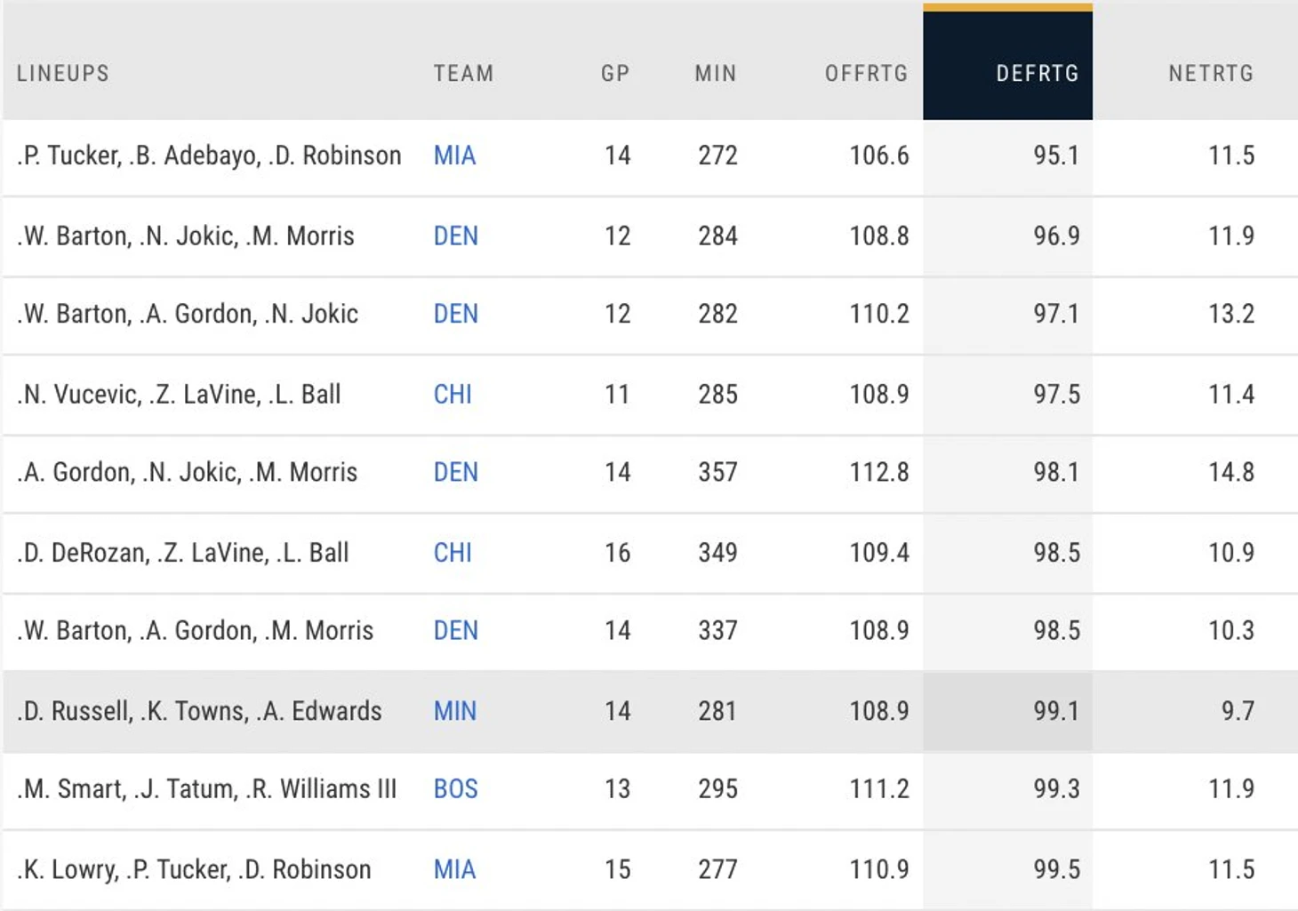 Я интерпретирую высокий защитный рейтинга Расселла так: у него важная роль в нападении, таким образом выполняя большой объем работы в атаке он помогает раскрыться таким ограниченным игрокам в атаке игрокам как Вандербилт, которые в свою очередь отрабатывают в защите. Поэтому Расселл нужен этой команде, на это намекает рейтинг +/-, где Расселл (вместе с Йокичем) находится на втором месте после Карри. Миннесота на первом месте в NBA по кол-ву трехочковых попыток за игру, при этом лишь на 16-ом месте по реализации. Чем больше дальних попыток, тем больше возможностей для подбора в нападении так как отскок в случае промаха длинный, поэтому логично что Вандербилт, который борется за каждый подбор в нападении приносит огромную пользу, выигрывая для команды дополнительные владения. Как подтверждение этой тактики мы вторые в лиге по кол-ву подборов в нападении и по проценту подборов после собственных промахов. Так было всегда: качественное нападение вытягивает защиту, а хорошая защита помогает нападению. Поэтому трио Таунс-Эдвардс-Расселл хорошо выглядит в защитных рейтингах. Среди 98-ми трио игроков NBA которые отыграли 250+ минут вместе, наши парни на 8-ом месте в защитном рейтинге. При этом против этой троицы соперники попадают всего 23% трехочковых!