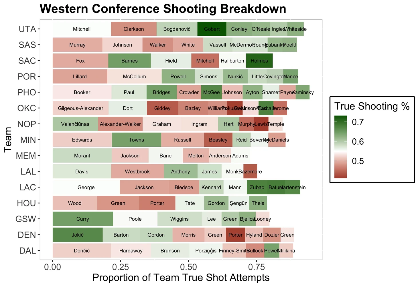Большие вопросы к тому как задействуют Таунса в клатче: исторически центровые тащат в первых трех четвертях, а в клатче решают игроки периметра, но Таунс – это уникальный по набору умений игрок и поэтому он может быть эффективен в клатче. К примеру Юта играет с ограниченным в атаке Гобером, который делает максимально эффективно одну «простую» вещь: вылавливает мяч своими длиннющими руками и отправляет его в кольцо. Обратите внимание, на графике показано, что Гобер забивает не так много, но «заточенность» командного нападения на постоянную угрозу кольцу через Гобера, делает эффективными ролевиков. Сравните с графиком Миннесоты, где не видно чтобы наличие Таунса значительно влияло на эффективность других игроков.