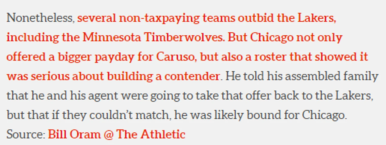 Команда просто не может привлечь внимание свободных агентов, последний пример: сейчас все любят Карузо, подписавшегося этим летом с Чикаго. Буллз играют в качественный баскетбол, одной из особенностью которого является игра маленькой пятеркой где сразу трое (Болл, Карузо и ДеРозан) могут отдать пас и забить сами, при этом Карузо и Болл является универсальными защитниками на периметре. И вот недавно стало известно, что Миннесота этим летом тоже пыталась получить Карузо, предложив больший контракт чем Лейкерс, но Алекс предпочел Чикаго и понятно почему.