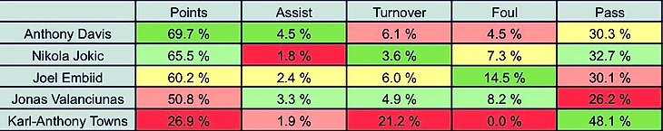 Таким образом Юта построила вокруг одного элитного умения Гобера все командное нападение, а Миннесота пока не может стабильно заигрывать универсала Таунса. Отчасти проблема кроется в самом Таунсе, который сильно похудел когда болел COVID-19, он и до болезни не мог стабильно продавливать оппонентов в краске, а теперь испытывает явные проблемы, когда борется за позицию спиной к кольцу. Ниже сравнение эффективности Таунса с другими игроками, когда они играют спиной к кольцу.